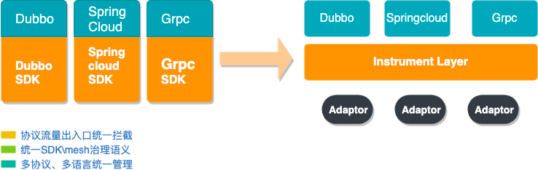 腾讯云微服务平台数据面在演进初期,在适配每个框架协议的时候,都会投入大量的成本,例如Spring Cloud本身版本众多,D到H每个版 本都有变化,甚至到了的2020结构大变。新增feature需要cherry-pick到每个版本代码上,利用了当前版本特性的功能,则无法复用到其他版本,类比至其他框架,Dubbo也存在这些问题,我们发现即使只支持Spring Cloud一个框架都会卷入大量的人力,更不用提其他自研框架。