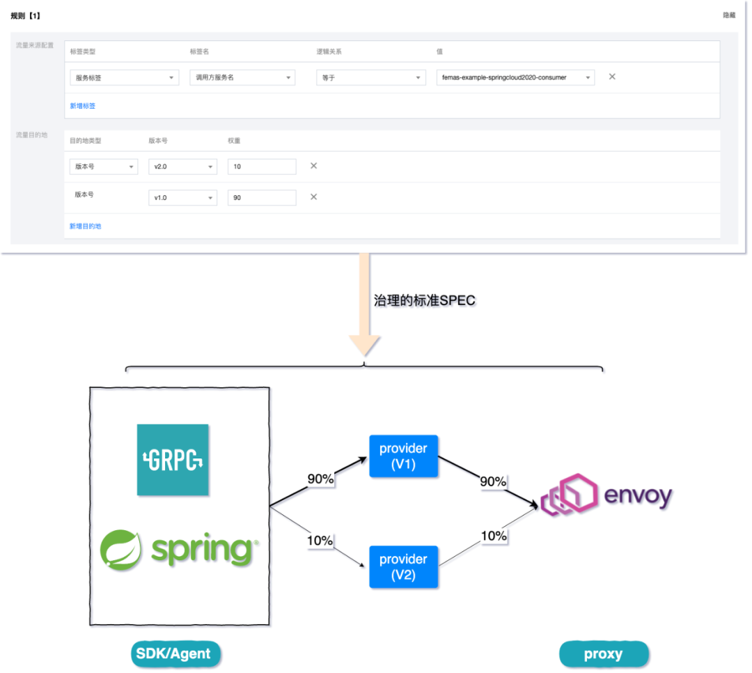 同一套控制面规则协议支持多数据面,既可下发规则到SDK/AGENT,也可以下发给Sidecar。