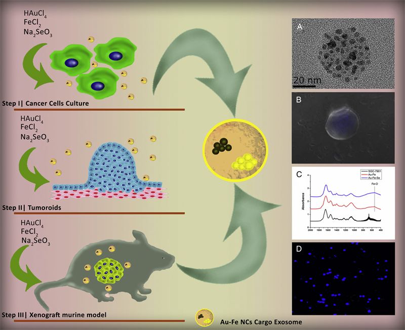 及时的癌症检测对于成功诊断和治疗癌症至关重要。这项研究描述了一种新方法,其利用原位生物合成的纳米级金和铁探针在肿瘤细胞环境中进行生物成像,并随后在循环系统内利用肿瘤外泌体包裹的该金-铁(Au-Fe)纳米簇中传播Au-Fe纳米簇。来自东南大学的研究人员在Nanomedicine杂志发表的结果显示,从离子前溶液(HAuCl4,FeCl2) 分别原位生物合成Au-Fe纳米颗粒后,在处理过的小鼠模型的血液中分离出包裹Au-Fe货物的外泌体,而且加入Na2SeO3补充剂后则会导致Au致死效应。各种差异表达基因的微阵列数据揭示了用Au-Fe-Se三联体离子溶液处理后SGC-7901细胞系中上调了肿瘤消融和金属结合基因。从肿瘤细胞分泌的含Au-Fe纳米簇生物外泌体(Nano in nano)的分离可能有助于早期诊断,并在相关治疗如放射性化学疗法等期间和治疗后反映肿瘤的消融状态。