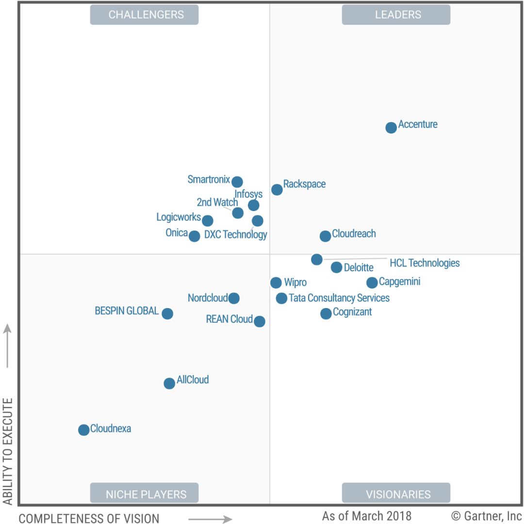 领导者象限今年显得更拥挤了,共有6家供应商,而2018名只有3家。埃森哲和Rackspace保住了领导者的地位,而Cloudreach移到了挑战者类别,Gartner提到扩展势头和用户群从反应不一变成积极反应是导致这种变化的两大原因。德勤、印孚瑟斯、Smartronix和威普罗都因广泛的可用性和支持多个云环境而进入了领导者象限。