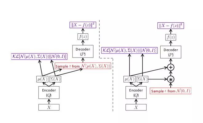 因此,我们的损失函数将包含两项。第一个是输入到输出的重建损失,第二个损失是 KL 散度项。现在我们可以使用反向传播(Backpropagation)算法来训练网络。但是有一个问题,第一项不仅依赖于 P 的参数,也依赖于 Q 的参数,但是这个依赖性并没有出现在上面的方程中。所以我们如何从分布 Q(z|X) 或 N[μ(X), Ʃ(X)] 中随机穿过我们抽样的层 z,以便 P 可以解码。渐变不能流过随机节点。我们使用重新参数化技巧(见图所示)使网络可微。我们从 N(μ(X), Σ(X)) 中抽样ε∼N(0,I),然后计算 z=μ(X)+Σ1/2(X)∗ε。