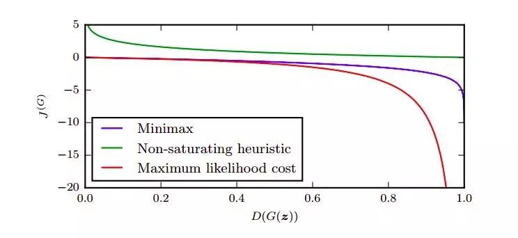 在上面的方程中,如果判别器的输入来自真实的数据分布,那么 D(x) 应该输出 1 来最大化上述关于 D 的目标函数,如果图像是由生成器生成的,那么 D(G(z)) 应该输出 1,以使关于 G 的目标函数最小化。从本质上说,G 应该生成这样的显示图像,它可以欺骗 D。采用梯度上升法(Gradient Ascent)使有关判别器的参数最大化,采用梯度下降法(Gradient Descent)最小化有关生成器的参数。但是在优化生成器目标方面存在一个问题,在游戏开始时,生成器还没有学到任何东西时,梯度通常非常小,当运行良好时,梯度非常高(见图 4)。但我们想要的是相反的行为。因此,我们将 E[log(D(G(z))] 最大化,而不是最小化 E[log(1-D(G(z))]。