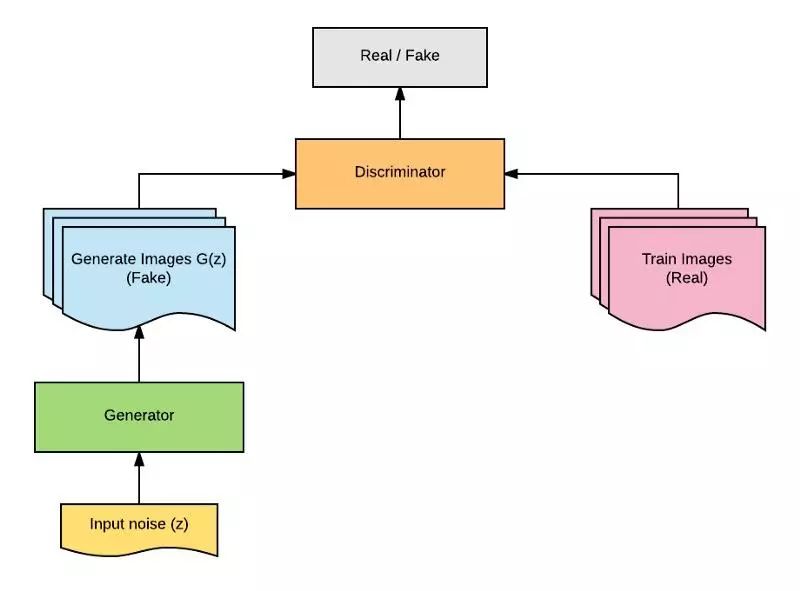 这是通过这两个网络的对抗训练来实现的。生成器(Generator)模型 G 学习捕捉数据分布,判别器(Discriminator)模型 D 估计样本来自数据分布而非模型分布的概率。基本上,生成器的主要任务是生成自然的图像,而判别器的任务是判断图像是假的还是真实的。这可以认为是一款迷你 max 的双人游戏,随着时间的推移,两个网络的性能都会提高。在这个游戏中,生成器试图通过生成真实图像来欺骗判别器,并通过提高其识别能力来避免被判别器迷惑。下图显示了 GAN 的基本架构。