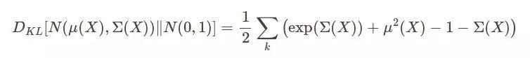 上面的方程有一个非常好的解释。术语 Q(z|X) 基本上是我们的编码器网络,z 是我们对数据 x(x∈X) 的编码表示,P(X|z) 是我们的解码器网络。因此,在上面的方程中,我们的目标是在 D_KL[Q(z|X)||P(z|X)],在某些误差下,极大似然估计数据分布。由于 P(z|X) 不易处理,但 KL 散度项≥0,因此很容易看出 VAE 试图最小化 log(P(X)) 的下界。这和最大化 E[logP(X|z)] 和最小化 D_KL[Q(z|X)||P(z|X)] 是一样的。我们知道最大化 E[logP(X|z)] 是一个极大似然估计,并使用解码器网络进行建模。正如我前面说过的,我们希望我们的潜在表示接近于高斯函数,因此我们假设 P(z) 为 N(0,1)。按照这个假设,Q(z|X) 也应该接近这个分布。如果我们假设它是具有参数μ(X) 和Ʃ(X) 的高斯分布,则由 KL 散度给出的这两个分布(即 P(z) 和 Q(z|X))之间的差异导致的误差的封闭形式的解,解决方案如下: