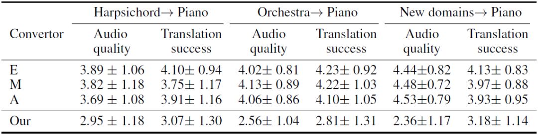 表 1:转换任务的 MOS 分数(均值 ± 标准差)。