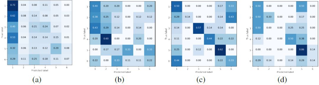 图 2:一组实验结果。(a)普通听众倾向于选择与源相同的域,无论实际源如何。(b)大部分时间下,音乐家 A 都无法识别出源。(c)业余爱好者 T 和(d)业余爱好者 S 也在大部分情况下无法识别,但是 S 的结果更一致。