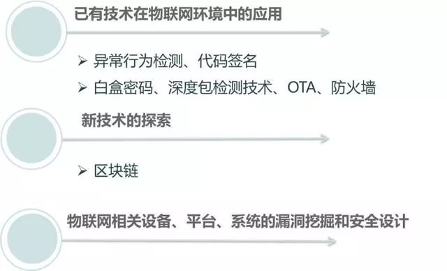 通过对物联网安全需求和对策的分析,我们总结出以下需要重点关注的技术,下面分别从已有技术在物联网环境中的应用、新技术的探索和物联网相关设备、平台、系统的漏洞挖掘和安全设计三个方面介绍物联网安全技术研究的一些思路。