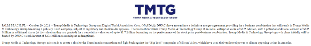 据报道,「真实社交」平台将通过由特朗普媒体和技术集团和一家SPAC公司「DWAC」合并而成的新公司创建。特朗普媒体与科技集团(TMTG)表示,目前与DWAC「已达成最终合并协议,进行业务合并」。