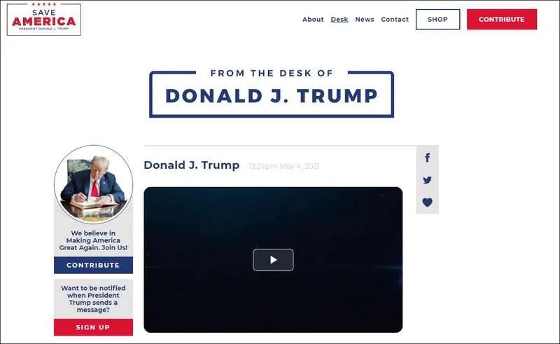 据报道,今年5月,在被Twitter和Facebook禁言后不久,特朗普就开了一个博客,名为「唐纳德·特朗普的办公桌」。