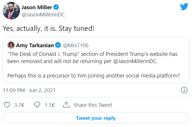 不过,在被问到此举是否是特朗普加入「另一个社交媒体平台」的「前兆」时,米勒发推特给出了毫不含糊的肯定回答:「是的,敬请关注!」