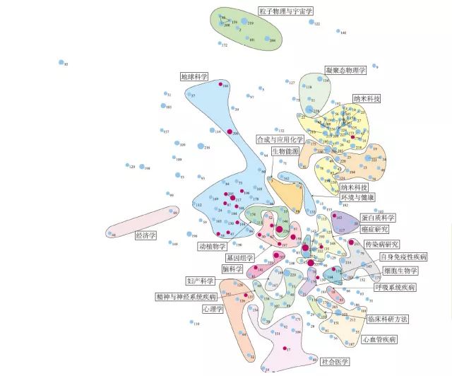 图中每一个圆代表一个研究领域,由一组论文组成,圆的大小与研究领域包含的核心论文数量成正比,旁边的数字代表研究领域的ID 号。圆之间连线代表研究领域之间具有较强的关联,各个圆之间的相对位置也反映出它们之间的关联程度,距离越近,关联程度越高。图中上下左右的方位没有实际含义;红色的圆代表该研究领域是热点研究领域;每个不规则区域内的研究领域属于同一个大类,用不同颜色区分。