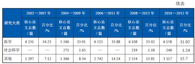 表2 列出了五个时期科学结构中各个研究大类核心论文数量及占全部核心论文的比例。