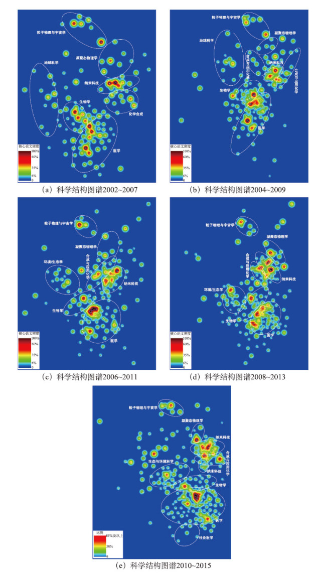 本文通过每隔两年绘制的科学结构图谱分析科学结构的发展情况。图3-3 采用密度图的方式展现2002 ~2007 年、2004 ~2009 年、2006 ~2011 年、2008 ~2013 年、2010~2015 年五个时期科学结构的时序变化。