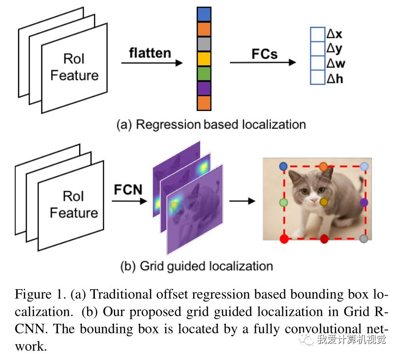 该文直取Grid(网格)修饰R-CNN,意即将目标检测中位置定位转化为目标区域网格点的定位。
