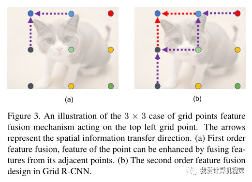 作者将距离特定网格点最近的相邻网格点(1个单位网格长度)组成的网格点集合的特征融合称为一阶特征融合,次近的相邻网格点(2个单位网格长度)组成的网格点集合的特征融合称为二阶特征融合。下图中(a)(b)分别展示了此融合过程。