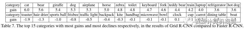 作者最后列出了Grid R-CNN对各目标类别的精度增益,发现那些矩形和长方形目标(例如键盘,笔记本电脑,叉子,火车和冰箱)往往获得更大的精度增益,而具有圆形性质的物体(例如运动球,飞盘,碗,钟和杯子)则性能下降或获得较小的增益。