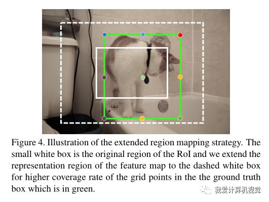 图中白色的实线框表示 RPN 给出的候选框,它没有完全包含所有的网格点。
