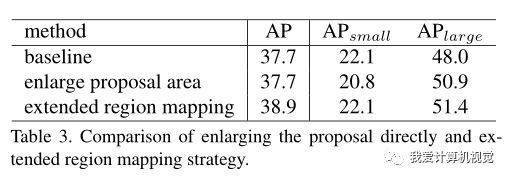 可见,直接扩大候选框区域的方法伤害了精度,而本文提出的扩展区域映射(extended region mapping)的方法则使精度有较大的提高(1.2个AP)。