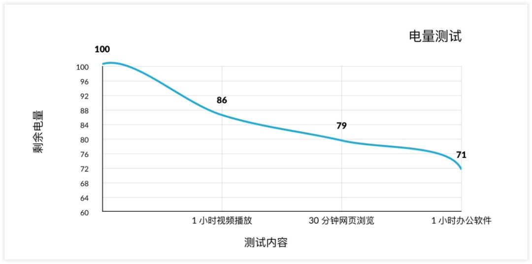 之后我又进行了一次更严谨的实际测试,进行了约 1 小时视频播放、30 分钟网页浏览、1 小时办公软件轻度办公(以 Word 和 Excel 为主),期间几乎不间断的播放音乐。2.5 个小时的中度工作娱乐之后,剩余电量仍然有 71%。