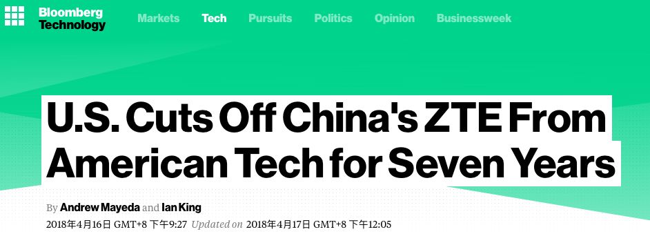 在 2018 年 4 月 16 日,美国商务部部长 Wilbur Ross 突然宣布,因违反了美国限制向伊朗出售美国技术的制裁条款,将禁止美国公司向中兴通讯销售零部件、商品、软件和技术,期限为 7 年。