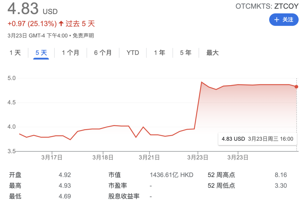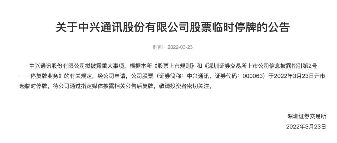 2022 年 3 月 23 日,深证证券交易所发布了一则《关于中兴通讯股份有限公司股票临时停牌的公告》,公告显示,中兴拟披露重大事项,该公司于 3 月 23 日开市起临时停牌。