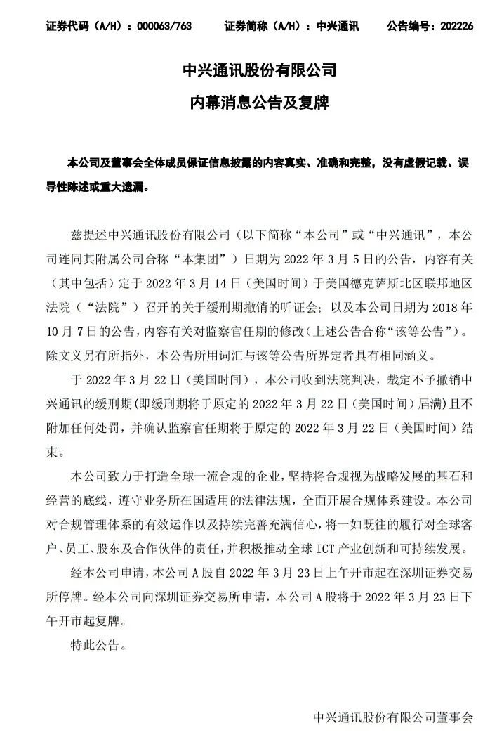 于 2022 年 3 月 22 日(美国时间),本公司收到法院判决,裁定不予撤销中兴通讯的缓刑期(即缓刑期将于原定的 2022 年 3 月 22 日(美国时间)届满)且不附加任何处罚,并确认监察官任期将于原定的 2022 年 3 月 22 日(美国时间)结束。