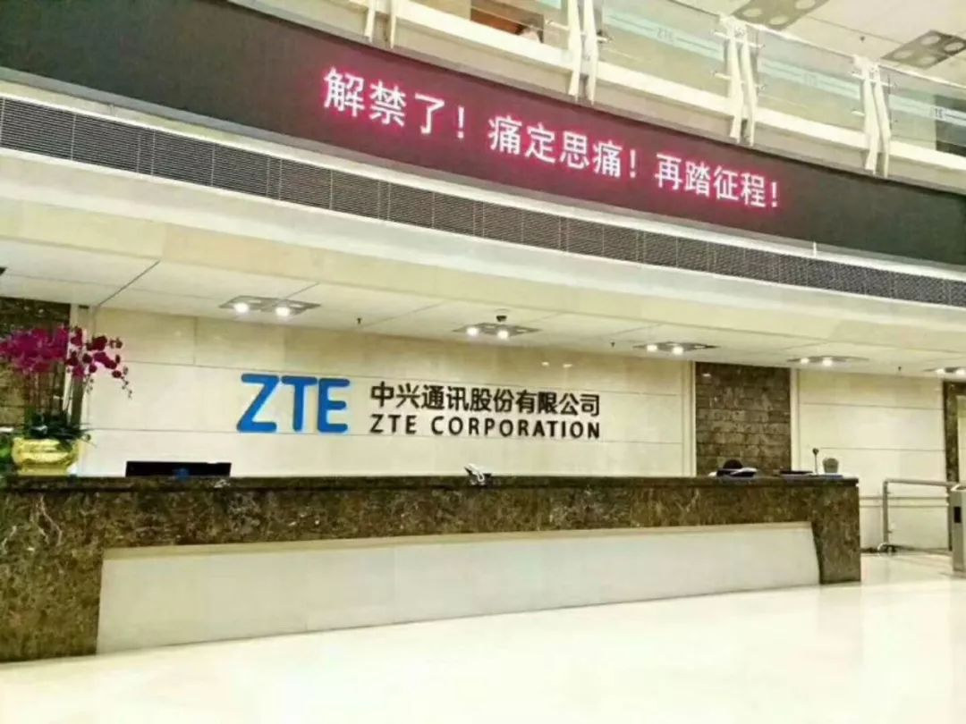 至此,表面的牵制正式告一段落。2018 年 7 月 14 日,中兴通讯总部屏幕上「解禁了!痛定思痛!再踏征程!」的标语。