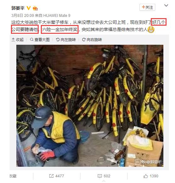 六险一金,还有年终奖,一天修个几十辆单车,月薪能拿到7000元,在招聘网站上搜一搜,共享单车修车岗位基本都是3500起步,还有额外奖金,这让做我们这些办公室情何以堪啊,不如转行去修车啊!