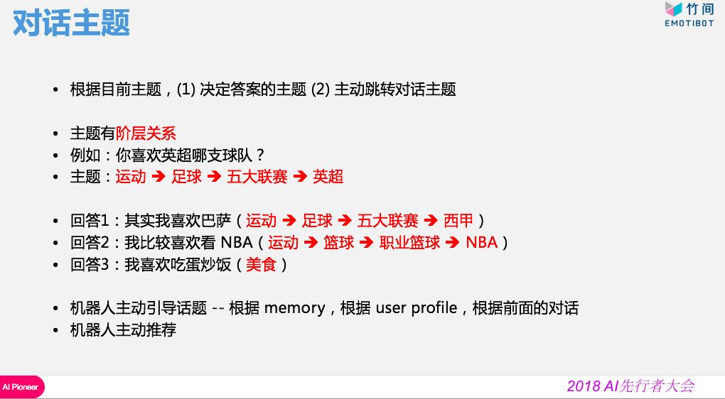 因此,如果机器人拥有长短时记忆及上下文理解,它可能有机会在对话无法继续时主动跳转主题来引导话题。根据这样的能力以及用户画像,机器人不再被动,反而能做到主动式推荐。