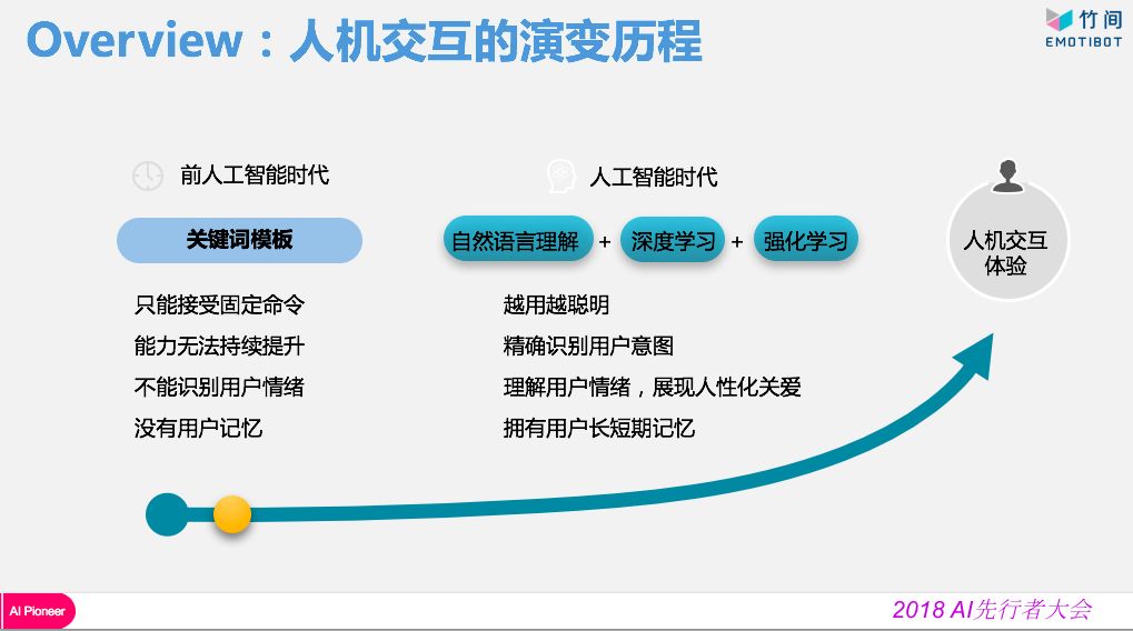 人机交互并非近年才存在,过去,人机交互依靠指令式进行,从三十年前DOS时代一行行的指令,渐渐到Windows的鼠标,再至手机、平板的触控式屏幕,由于这些交互设备的特性,使得关键词模版得以回应使用者。然而其带来的劣势也显而易见,因只能接受固定命令,因此无法提升机器能力,在无法识别用户情绪下,也难以理解用户,遑论拥有用户记忆。
