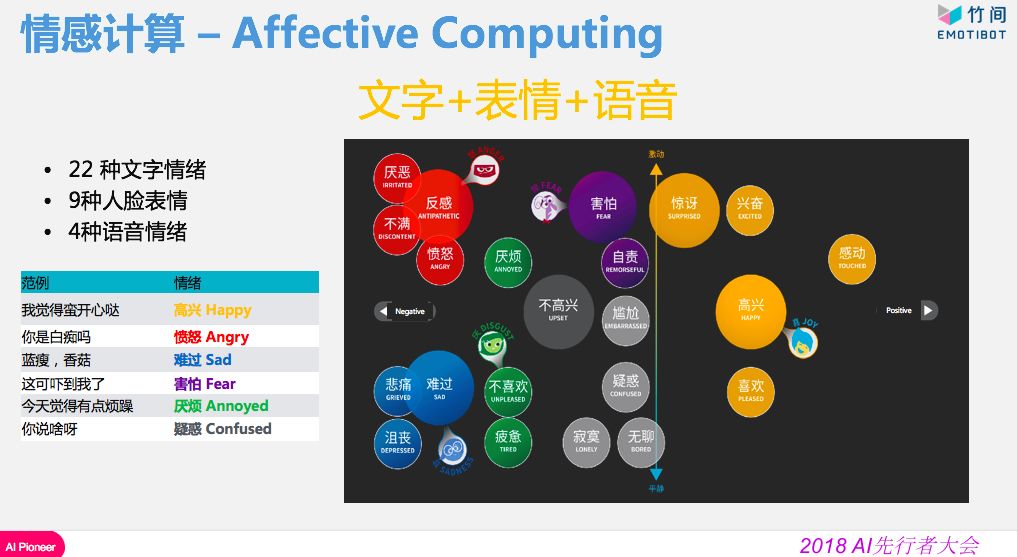竹间名字叫EMOTIBOT,即Emotional加上Robot,意谓着带有情感的机器人。情感计算在人机交互中占有何种地位?当我们和他人在沟通时,单靠文字其实难以真正判读情绪,若通过文字加语音,起码能有更多把握,当文字、语音和表情共同出现时,便能大致掌握对方情绪。因此,竹间目前做了4种语音情绪,9种人脸表情及22种文字情绪。通过将语音情绪、人脸表情及文字情绪加总的多模态情感计算,使机器能做到理解用户情绪进而提升人机交互体验。