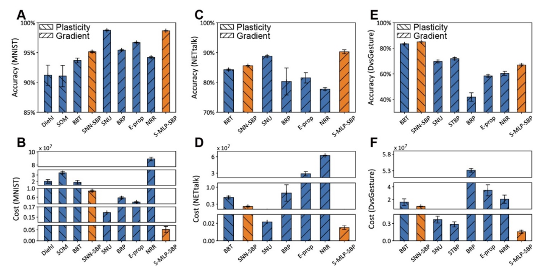 (B,D,F)SBP分别取得了基于梯度和基于可塑性方法的SNN最低能耗。
