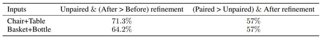 图 2:使用配对或未配对数据训练桌椅组合任务的测试结果。「NN」代表成对训练集中最接近的图像,「NoInpaint」表示在没有修复网络的情况下未配对模型的结果。在配对和未配对情况中,cˆ before 和 cˆ after 分别表示在推理细化网络之前和之后的生成器的结果。cˆ after s 表示细化步骤后的有遮掩的转置输入的总和。
