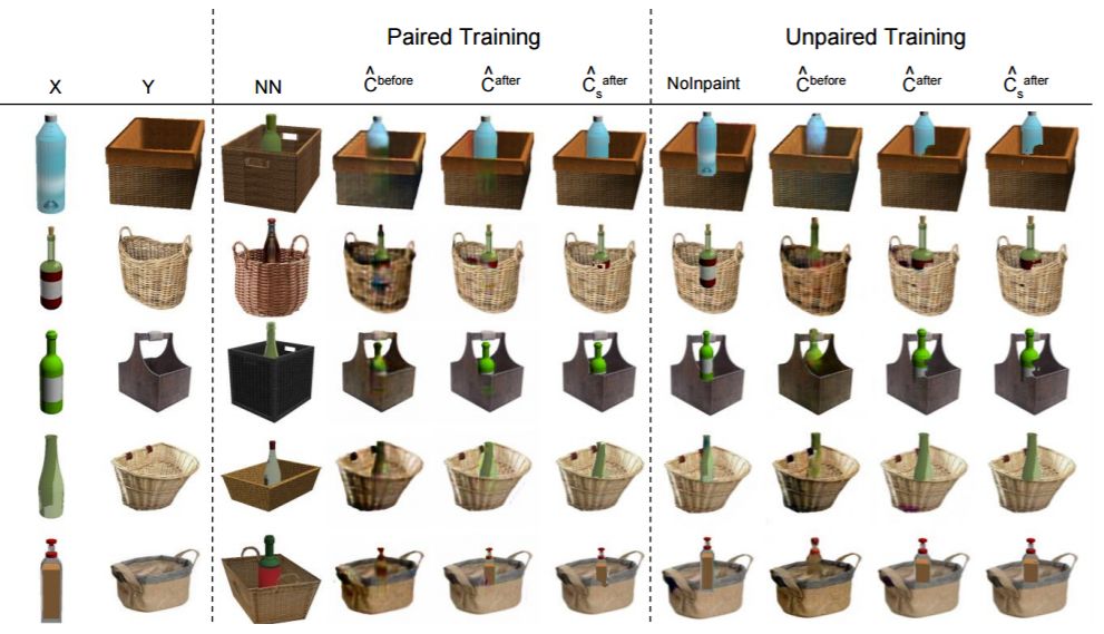 图 3:用配对或未配对数据对篮子-瓶子组合任务训练后的测试结果。「NN」表示在配对的训练集中最近的图像,「NoInpaint」表示在没有修复网络的情况下用未配对数据训练得到的模型。在配对和未配对情况中,cˆ before 和 cˆ after 分别表示在推理细化网络之前和之后生成器的输出结果。此外,cˆ after s 表示细化步骤之后遮掩情况下转置输入的总和。