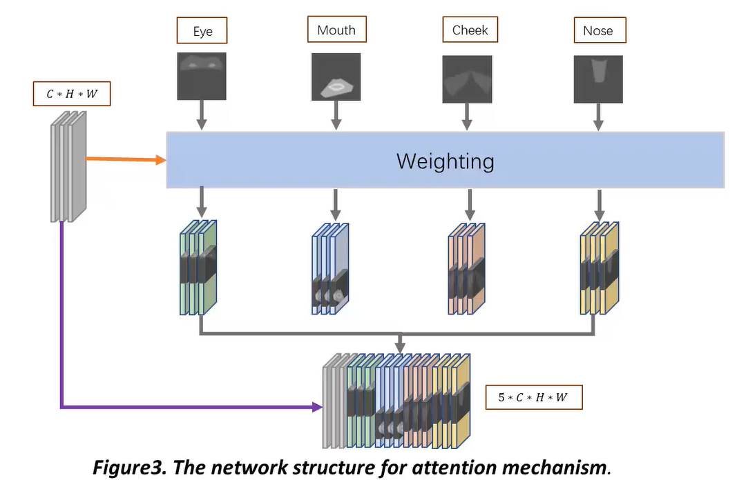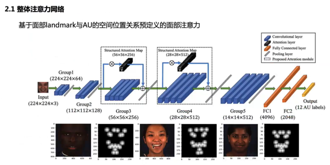 受注意力机制应用在各种视觉任务的启发,基于注意力的AU检测也得到了一定的发展。一方面,由于AU与相应的肌肉动作有关,每个AU的活动区域也相对有限。通常由面部landmark定义面部相关任务的空间位置。相关研究表明使用预定义的注意力机制来裁剪或增强面部区域对于面部AU检测任务来说是有帮助的。
