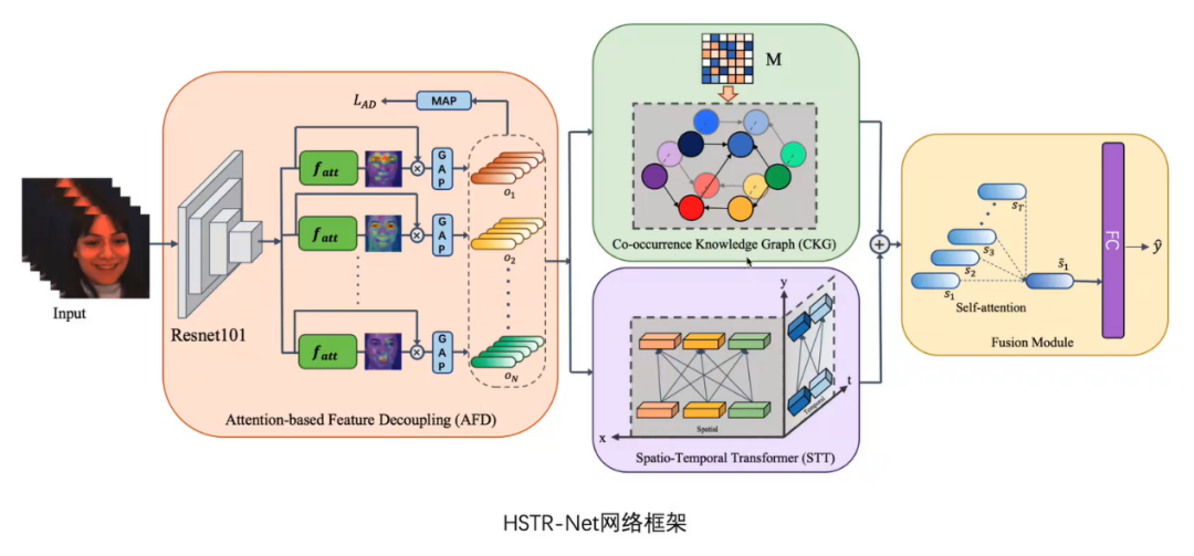 接下来,宋同学也介绍了她们正在审稿中的一项工作,即用于面部动作单元检测的异构时空关系学习网络。面部动作单元的时间关系和动作关系等属性使得AU检测不同于一般的多标签分类任务。因此,如何捕获AU的空间和时间共现成为提高检测精度的关键。在安高云教授的指导下,宋同学等人提出了一个异构的时空关系学习网络(HSTR-Net)来捕获AU的时空关系。网络框架如下所示: