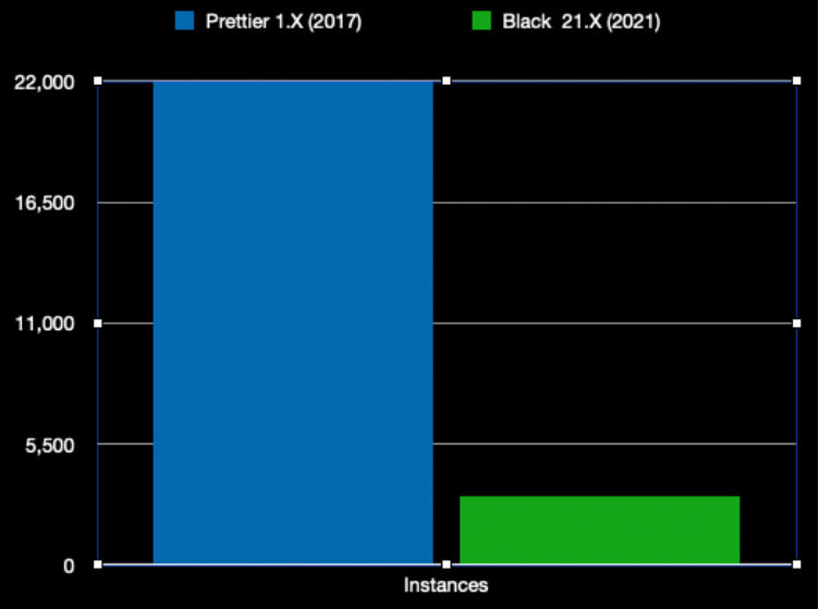 prettier 目前最新的版本是 v2.7.1,black 是 v22.10.0。上图中显示的数据量远低于实际情况,因为我们可以通过多种方式引用 prettier,而这个结果只是通过 package.json 设置直接运行 prettier 的项目。