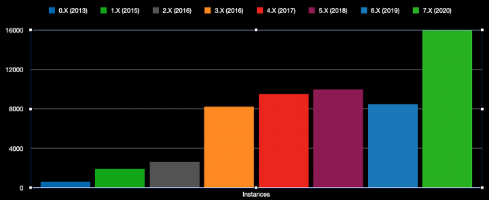 此外,我们发现还有其他大量使用过时版本的项目,甚至还有代码库使用零版本的 ESLint。以下是各个开源项目使用 ESLint 的版本分布详情: