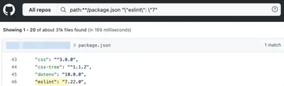 ESLint 是一个很方便分析的目标,因为你可以利用 package.json 文件检查版本。首先,我想了解有多少个代码库甚至连 ESLint 主版本都处于落后状态,仍在使用版本 eslint:7.x.x。所以,我进行了如下搜索: