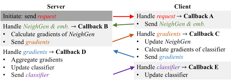 尽管FL已被应用于各种类型的数据,但联邦图学习(FGL)的重要性和独特性使其值得在本教程中占据专门的部分。首先,我们列举了几个真实的FGL应用,包括推荐系统[22]、医疗健康[29]、反洗钱[18]等,来吸引我们的受众。这些应用表明,联邦处理图数据的需求是非常普遍和强烈的。然后,我们将展示如何通过将原始图拆分为子图来将普通图数据集转换为联邦图数据集。我们将比较两种流行的分裂策略,随机分裂和基于社区的分裂[1]。接下来,我们演示了如何基于PyG[5]实现一个图神经网络(GNN),以及如何将所开发的GNN模型集成到FL框架中并进行FGL。最后,我们将学习后的GNN模型与整个图、客户端子图和FGL进行性能比较。与此同时,这个示例暗示了完成每个客户端子图的潜在优势。因此,我们进一步介绍了最近关于这个主题的一项工作—federatedage +[29],描述了它的公式以及如何使用FederatedScope[24]实现它。由于FGL算法(如FedSage+和GCFL+[23])经常要求在FL参与者之间交换异构数据,并表现出更复杂的行为,因此它们的实现使观众对FederatedScope的事件驱动设计有了更多的了解。最后,我们将介绍一个最近的FL包[20],它专门用于FGL。