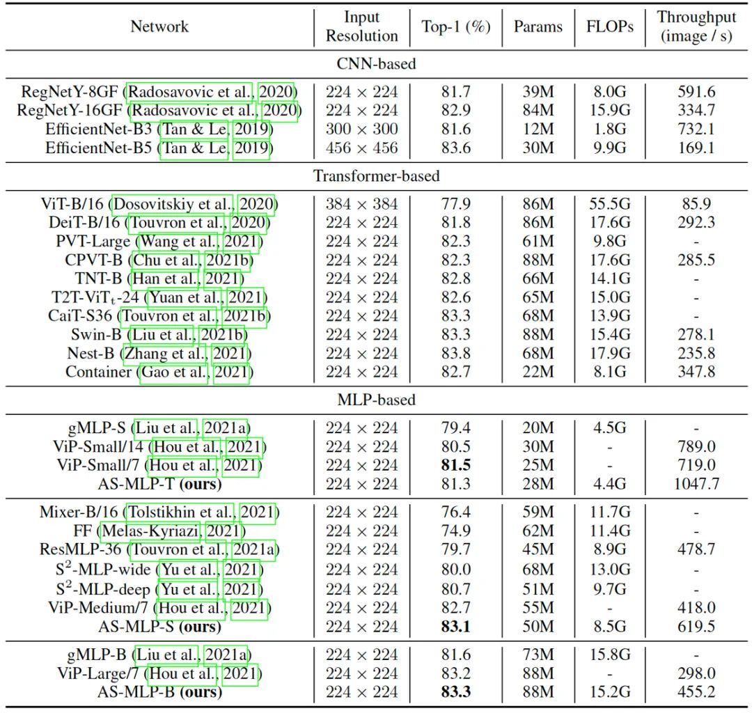 表一显示了所有网络在图像分类任务上的结果。我们将所有网络架构分为基于 CNN、基于 Transformer 和基于 MLP 的架构。输入分辨率为 224 x 224。当保持相似的参数量和计算量时,我们提出的 AS-MLP 优于其他基于 MLP 的架构。例如,AS-MLP-S 获得了83.1%的准确度,这优于 Mixer-B/16 (76.4%) 和 ViP-Medium/7 (82.7\%)。此外,与基于Transformer的网络框架相比,它获得了具有竞争力的性能。例如 AS-MLP-B 获得了83.3%的准确度,这与Swin-B的性能相当,显示了我们的 AS-MLP 框架的有效性。
