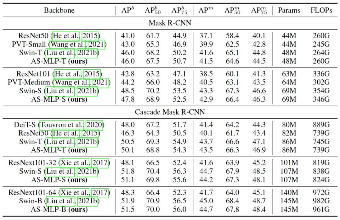 目标检测和实例分割的结果见表二,值得注意的是,我们没有将我们的方法与 MLP-Mixer 进行比较,因为它使用固定的空间维度进行 MLP操作,目标检测的输入尺寸不是固定的,因此不能迁移到目标检测中。据我们所知,我们是第一个将基于 MLP 的架构应用于目标检测的工作。我们的 AS-MLP 在类似的资源限制下实现了与 Swin Transformer 相当的性能。具体来说,Cascade Mask R-CNN + Swin-B在145M参数下达到51.9 ,Cascade Mask R-CNN + AS-MLP-B在145M参数下获得51.5 。图五也显示了目标检测和实例分割的结果。