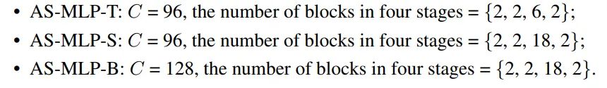 图四显示了AS-MLP框架的各种变种。不同的框架配置具有不同的参数量和计算量,用于与其他方法进行公平的结果比较。