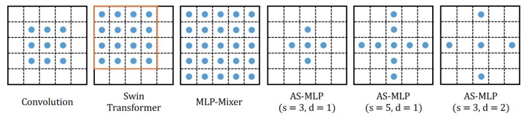 我们也对不同操作的感受野进行了分析,图三显示了神经网络中不同操作的感受野。在AS-MLP中,我们能使用不同的shift size和dilation rate,因此使得网络具有不同的感受野。例如,图四中的第六张图显示了当shift size为3,dilation rate为2时候的感受野大小。