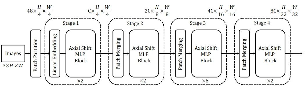 总体的网络结构如图一所示,AS-MLP一共有四个stage,对于图像分类任务,输入分辨率为224,在经过不同的stage时分辨率逐渐降低,最终的输出将使用交叉熵损失做图像分类。