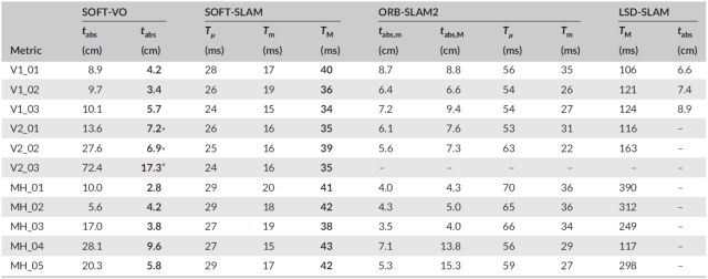 同时,SOFT-SLAM系统可以在困难场景下仅使用一个两线程的板载计算机获得确定性的结果,并且能够实现20Hz的恒定执行速率。更值得一提的是,无人机使用SOFT-SLAM在EuRoC的挑战3,阶段IIa-基准测试,任务2数据集中获得了最高定位精度。此外,作者还在两个主流数据集上对SOFT-SLAM系统进行了详细评价,并与其他主流的系统(如ORB-SLAM2, LSD-SLAM)进行了对比,结果显示SOFT-SLAM在大多数数据集上能够获得更高的精度,并且具有更高的运行效率。