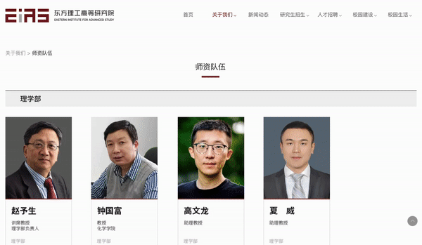 再来看看东方理工大学的师资情况。据官网消息,目前理学部、工学部和信息学部都已有师资储备,不过其中尚未看到商学部的身影。