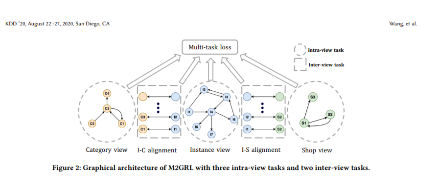 将图表示学习与多视图数据(边信息)相结合进行推荐是行业发展的趋势。现有的方法大多可以归类为多视图表示融合;他们首先构建一个图,然后将多视图数据集成到图中每个节点的一个紧凑表示中。然而,这些方法在工程和算法方面都引起了关注:1)多视图数据在工业中是丰富的,信息量大,可能超过单个向量的容量,2)由于多视图数据往往来自不同的分布,可能会引入归纳偏差。在本文中,我们使用一种多视图表示对齐方法来解决这个问题。特别地,我们提出了一个多任务多视图图表示学习框架(M2GRL)来学习网络规模推荐系统的多视图图的节点表示。M2GRL为每个单视图数据构造一个图,从多个图中学习多个单独的表示,并对跨视图关系进行对齐。M2GRL选择多任务学习范式,共同学习视图内表示和跨视图关系。此外,M2GRL利用同方差不确定性自适应调整训练任务的权重损失。我们在淘宝上部署了M2GRL,并在570亿个例子上训练它。根据离线指标和在线A/B测试,M2GRL的性能显著优于其他最先进的算法。淘宝多样性推荐的进一步探索表明了利用所产生的多种表示的有效性,我们认为这对于不同焦点的行业推荐任务是一个很有前景的方向。