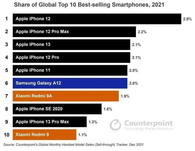 苹果对于3000-4000元之间的中低端机型,似乎也有些信心不足,要知道,两年前苹果发布的二代iPhone SE,直到2021年都位列全球畅销智能手机TOP10。