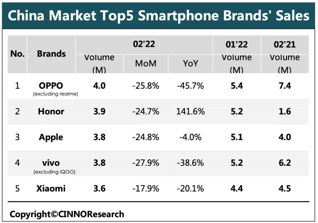 CINNO Research报告中提到,从2月底至今这一个多月里,国内多地疫情出现反复,这也为国内手机厂商复工复产带来较多不利影响,是2月手机整体表现下滑的主要原因之一。